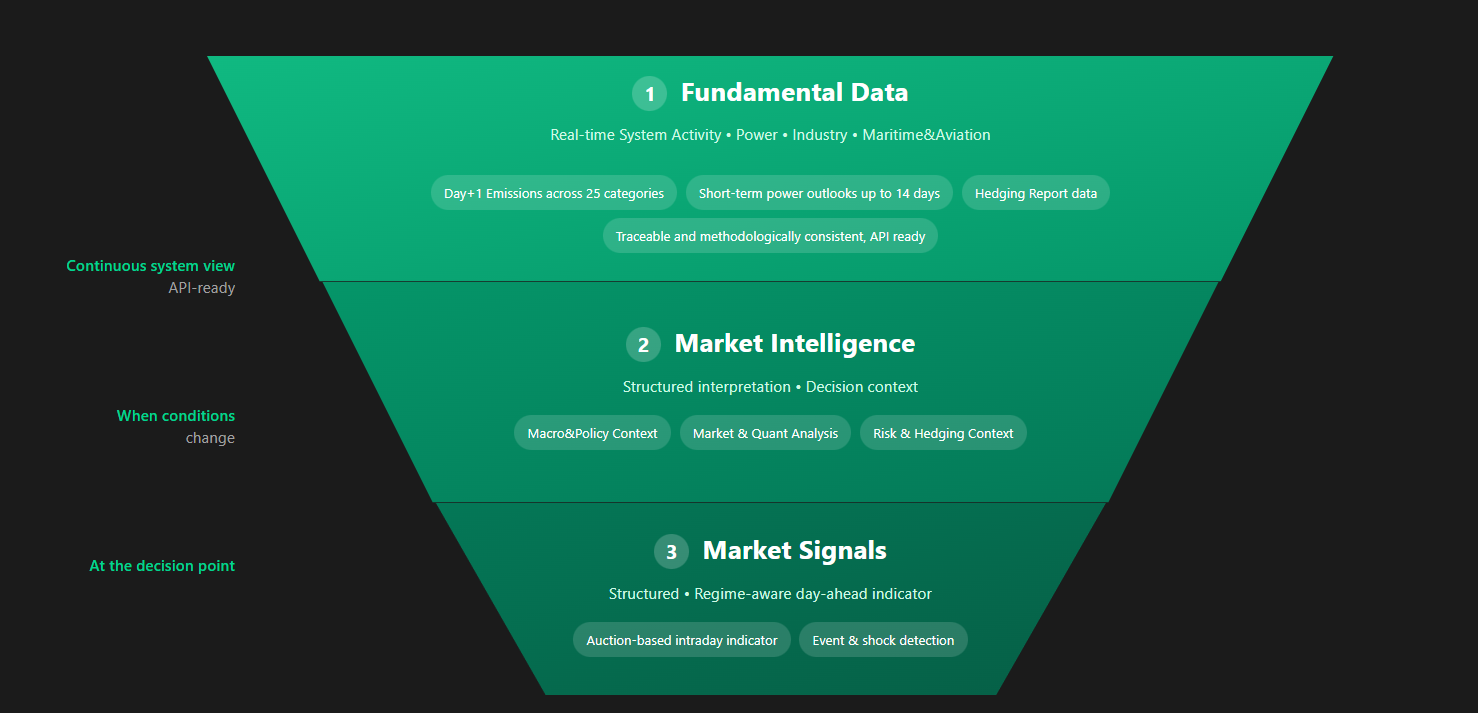 We combine EU ETS analytics, real-time carbon emissions data, and regime-aware EUA trading signals to help market participants navigate short-term volatility with confidence.